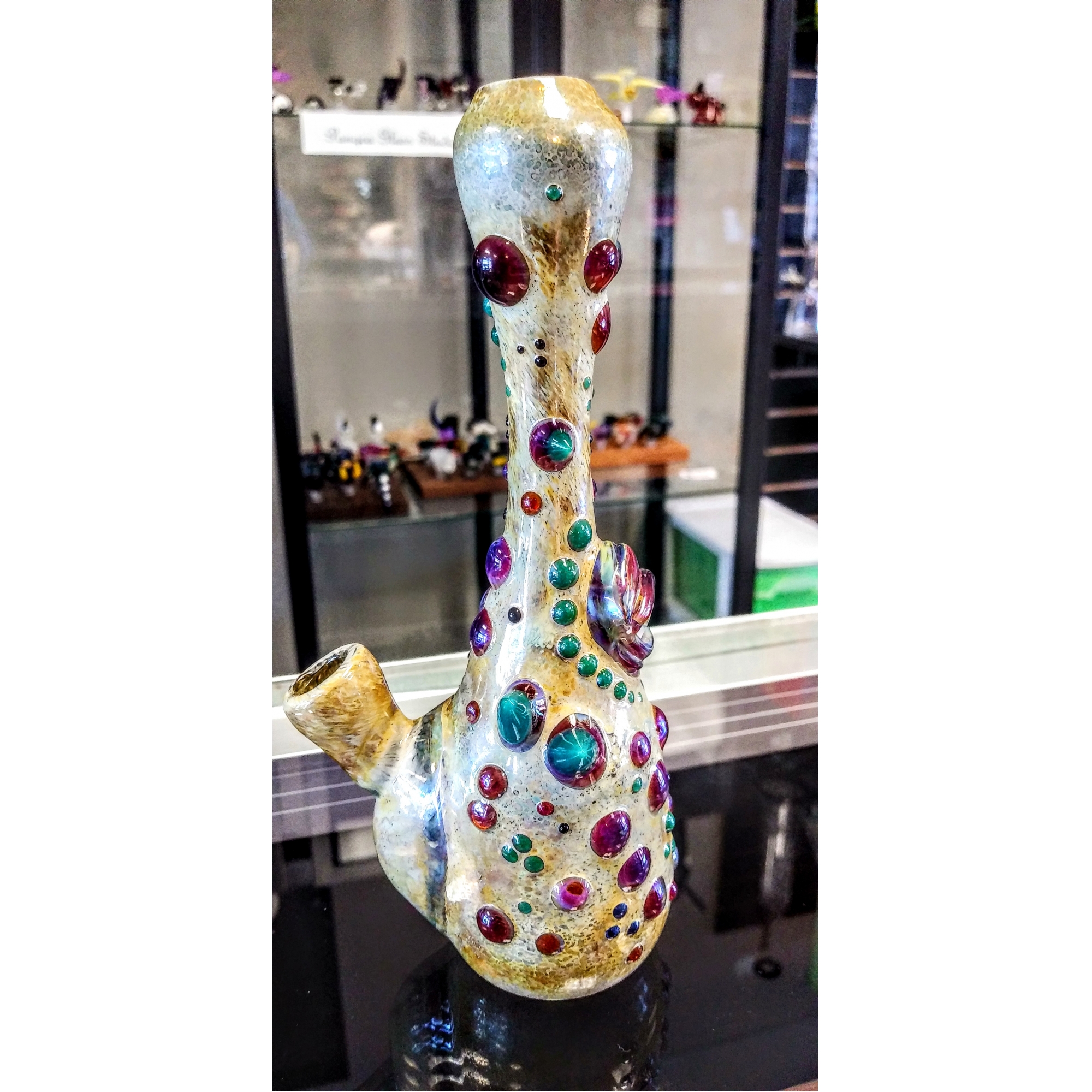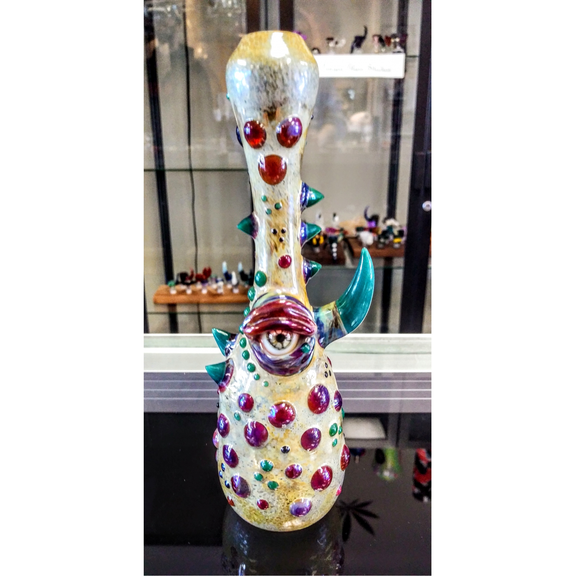 A Custom Canadian Blown Rig by Canadian Glassblower Drewski Glass. He enjoys making pieces that centre around eyes. His pieces are Made with Borosilicate for strength and tested rigorously for Quality.