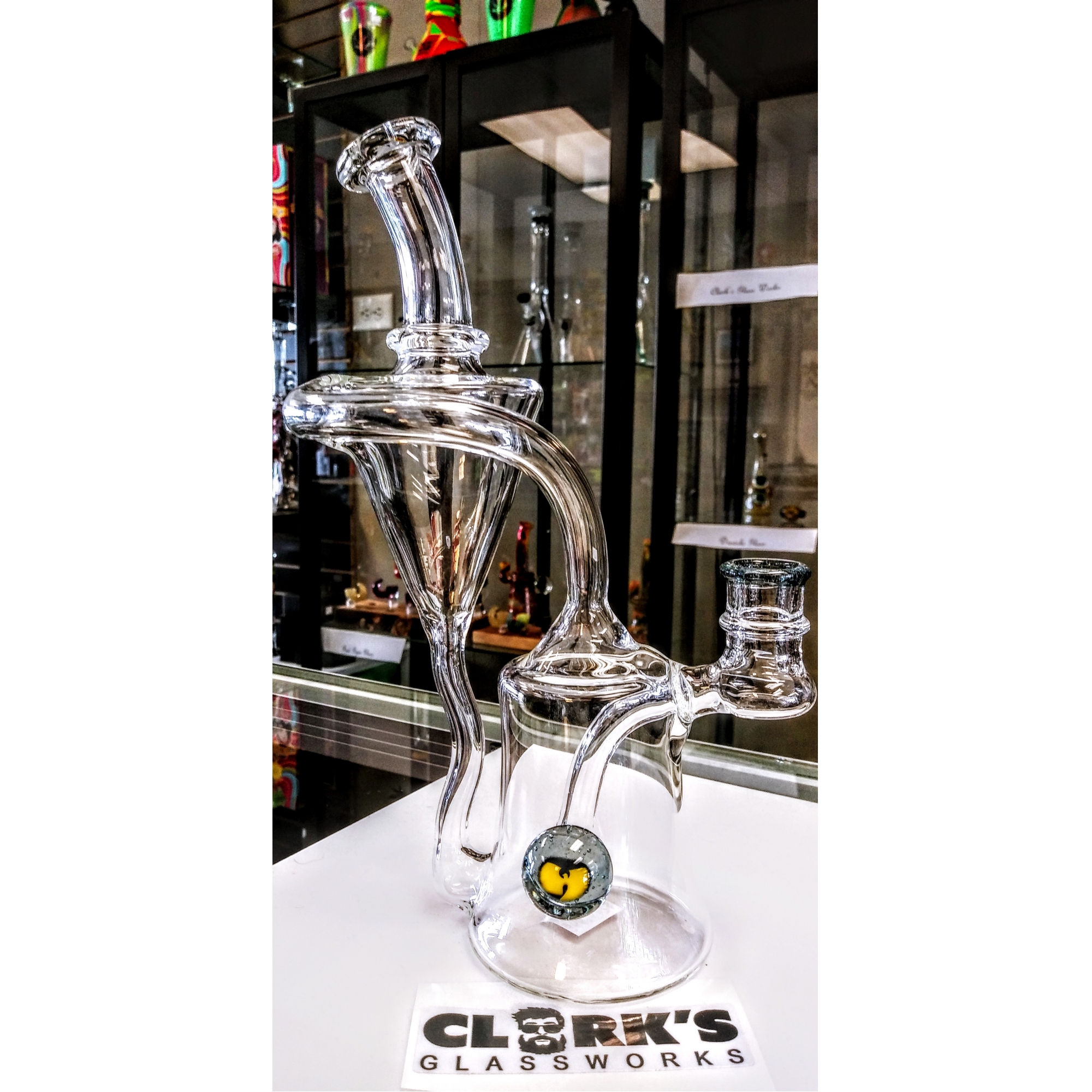 This Recycler is Handblown in Canada by Clarks Glasswork. The recycler is made with borosilicate to strengthen it. There is a marble on the side with the Wutang Clan symbol & a smoky accent around the Downstem.